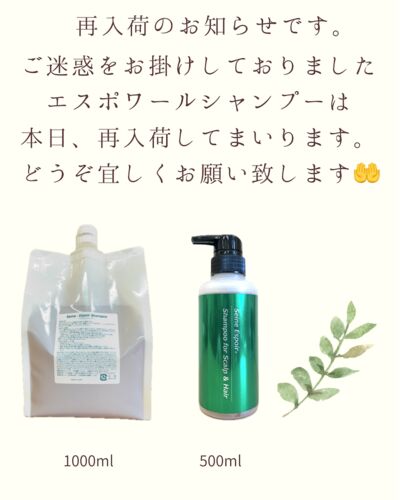 大変長らくお待たせを致しました。 お陰様で大人気となりました『エスポワールシャンプー』ですが品切れが続出し、大変ご迷惑をお掛けしております。 大変お待たせをいたしましたが、本日、再入荷してまいります。 どうぞ宜しくお願い致します。