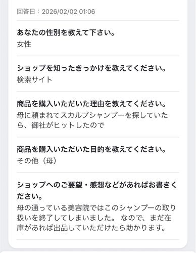 今日は先日ネットショップにてアンケートに『母の通っている美容院ではこのシャンプーの取り扱いを終了してしまいました。 なので、まだ在庫があれば出品していただけたら助かります。』と書かれていたお母様、ご本人様より当店にお電話がありました。 聞く…